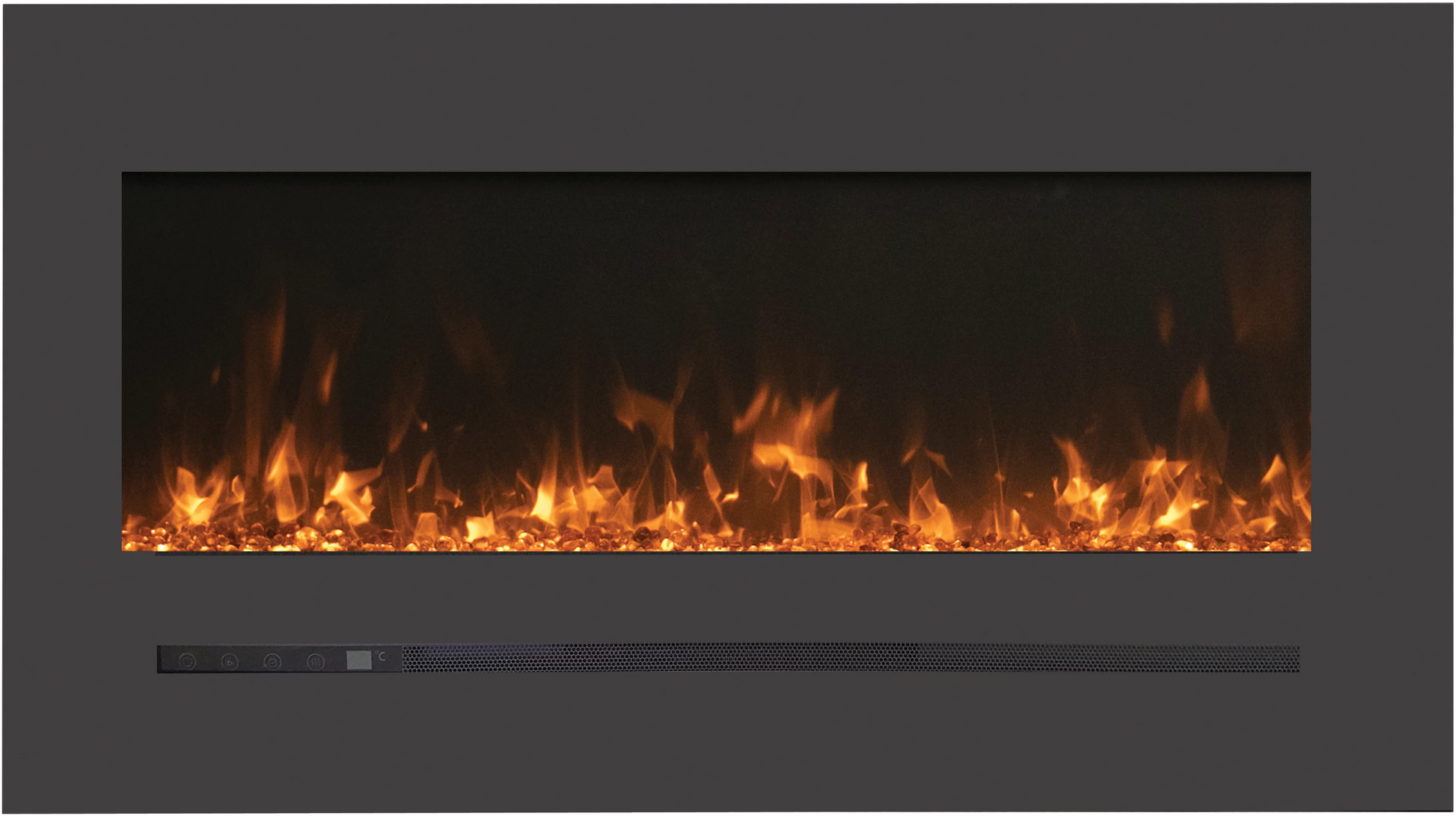 The WM-FML-STL the amantii wall mount electric fireplace series features a deep charcoal colored steel surround. The steel surround has aesthetic proportions and features a touchpad with a numerical temperature display.