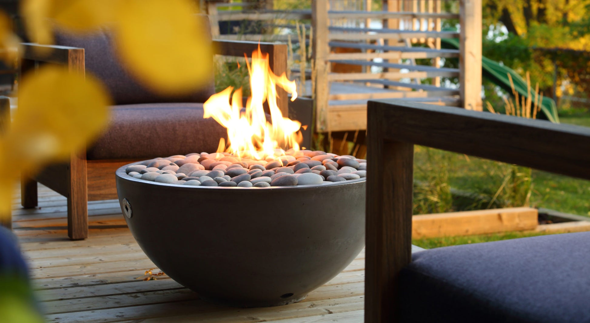 The Outdoor Fire Pit or Bowl is the perfect way to enhance your enjoyment of any outdoor space. Ideally suited for use on a wood deck or patio, the Outdoor Fire Pit and Bowl come complete with lava rock and are fueled by either natural gas or propane. Decorate your Outdoor Fire Feature with the choice of decorative stones, log set, or five different colors of crushed glass media.
