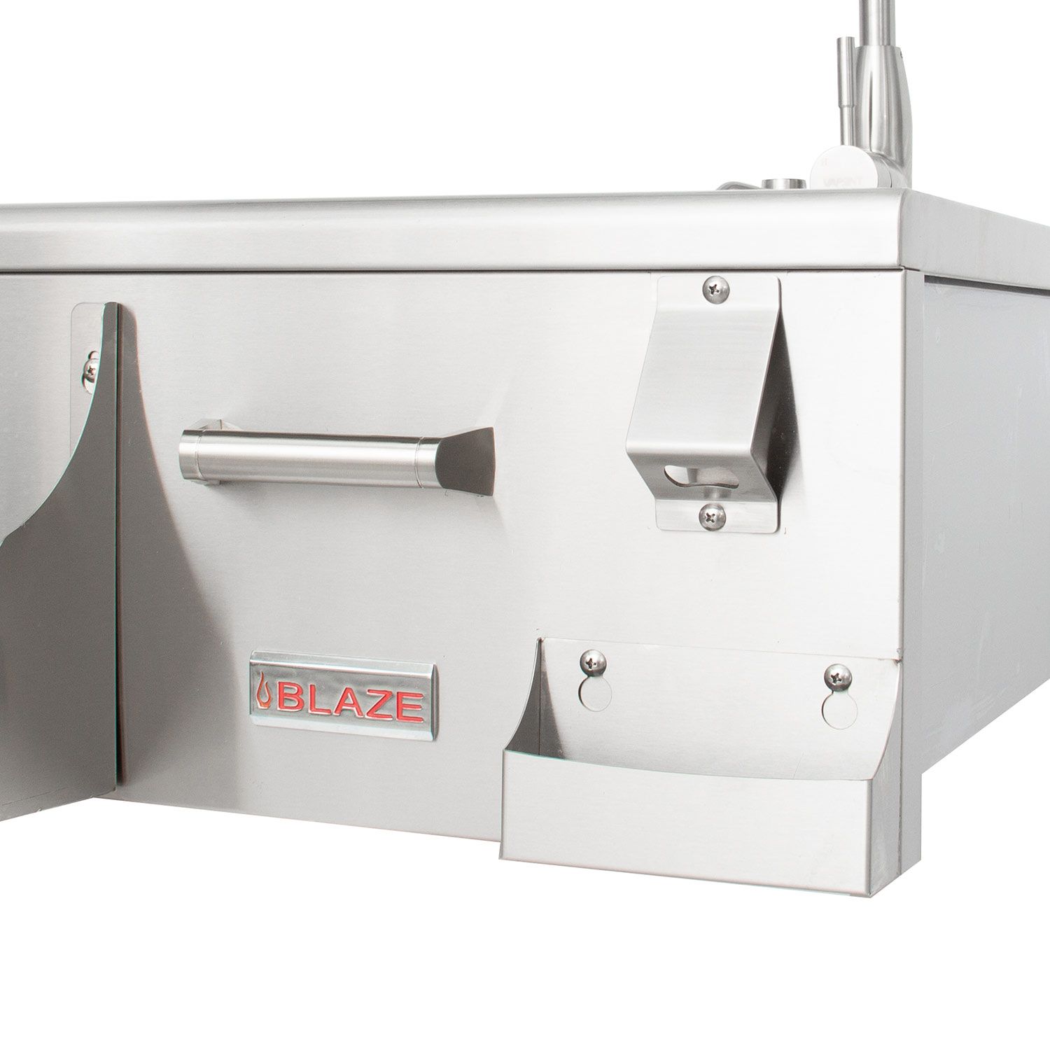 The Blaze Beverage Center was designed with both style and usability in mind. For quick and easy access, there is an attached bottle opener, a built-in soap dispenser, a front bottle storage and a removable three-part condiment tray. Plus, Blaze includes a cutting board that slides across the sink and can be removed for extra space. Made from 304 stainless steel, this beverage center is both durable and stylish with a sleek design and curved edges. This beverage center fits perfectly in any outdoor kitchen.