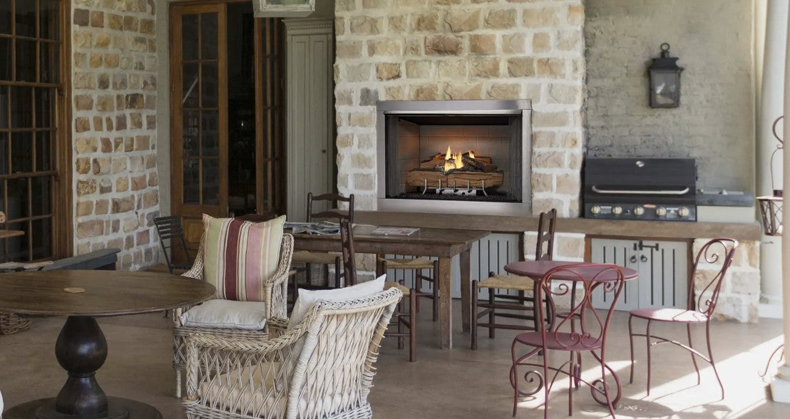 Create a getaway outside your door. With stainless-steel construction, the Vesper ventless outdoor gas fireplace handles the elements. Place it anywhere with no venting or chimney needed. Get a big view of the flames with a 27" tall opening either 36" or 42" wide. Pick from three real-life log sets accented by a traditional or herringbone brick interior.