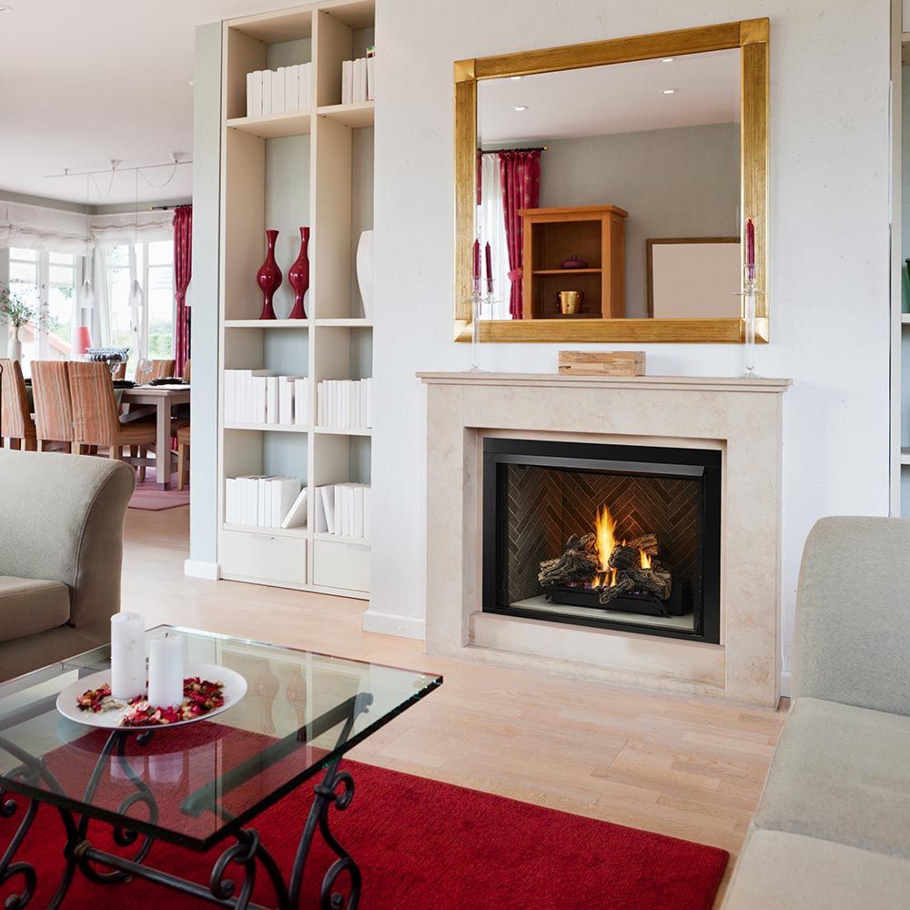 - Flush-hearth design and tall opening mimic a wood-burning fireplace