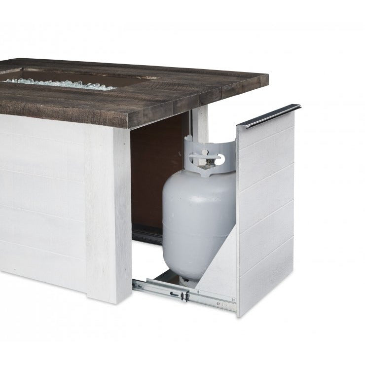 The Alcott Fire Pit Table portrays a modern farmhouse aesthetic. This unique fire table features an Antique Timber Supercast concrete top with a white-washed shiplap base. The Alcott delivers a warm glow for a relaxing, enjoyable time outside, featuring a Dora Brown Crystal Fire Plus burner. The rustic and contemporary look is sure to have you in love with your outdoor space for years to come.