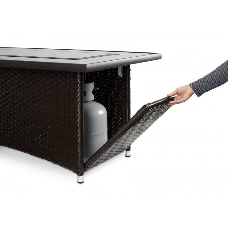 The Montego Gas Fire Pit Table offers a unique, versatile design to fit your patio style. This stylish fire pit table also is made of durable materials for year-round outdoor use. Clean and simple lines put the focus on the dazzling 12 x 42 Crystal Fire Plus burner. Take a closer look at the details of the stunning wicker base while the gorgeous flames reflect off the black glass top.