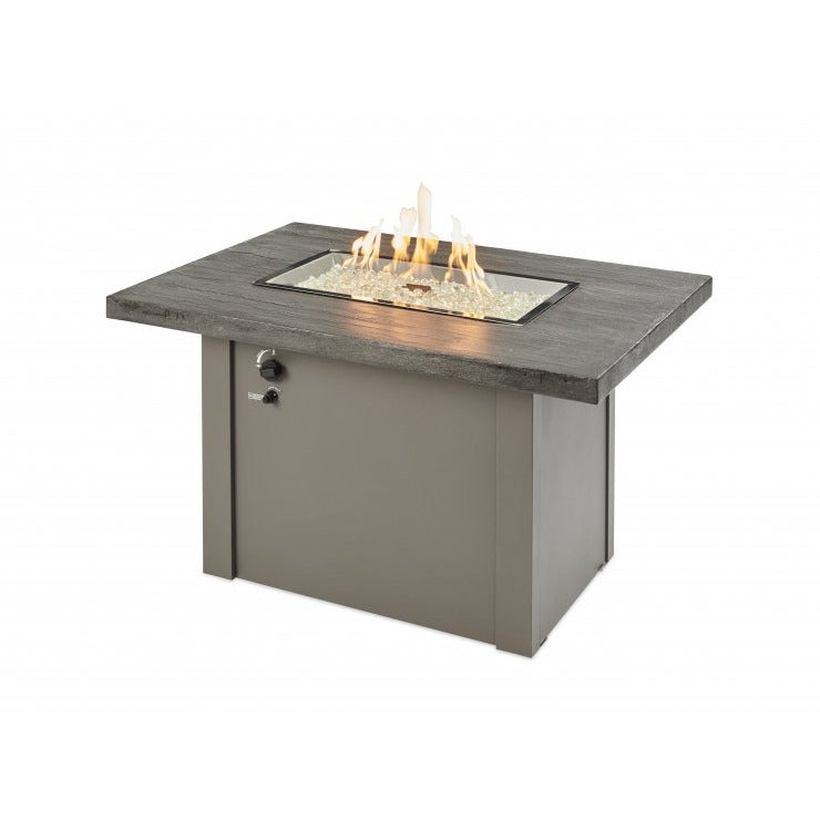 The Stone Grey Havenwood Gas Fire Pit Table offers a contemporary style thats perfect for entertaining. The unique Stone Grey Everblend textured top pairs with a Grey powder-coated metal base. The 12" x 24" Crystal Fire Plus burner offers a warm, inviting glow. Every handcrafted Everblend top is one-of-a-kind variations in color, texture, and pattern will occur.